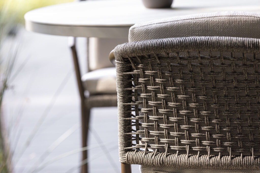 De chique Emilia-stoel is verkrijgbaar als stapelbare eetstoel en als high dining chair, en voegt een verfijnde touch toe aan elke buitenruimte. Het bronskleurige aluminium frame wordt gecombineerd met een rond, dubbel geweven wengé rope, wat de stoel een luxe uitstraling geeft. De gebogen rugleuning heeft een volmaakte, elegante vorm, maar behoudt een gedeeltelijke doorzichtigheid die het design licht en luchtig maakt. Het rope dat om de armleuning is geweven, accentueert de verfijning van de stoel en voegt een extra dimensie van luxe toe.