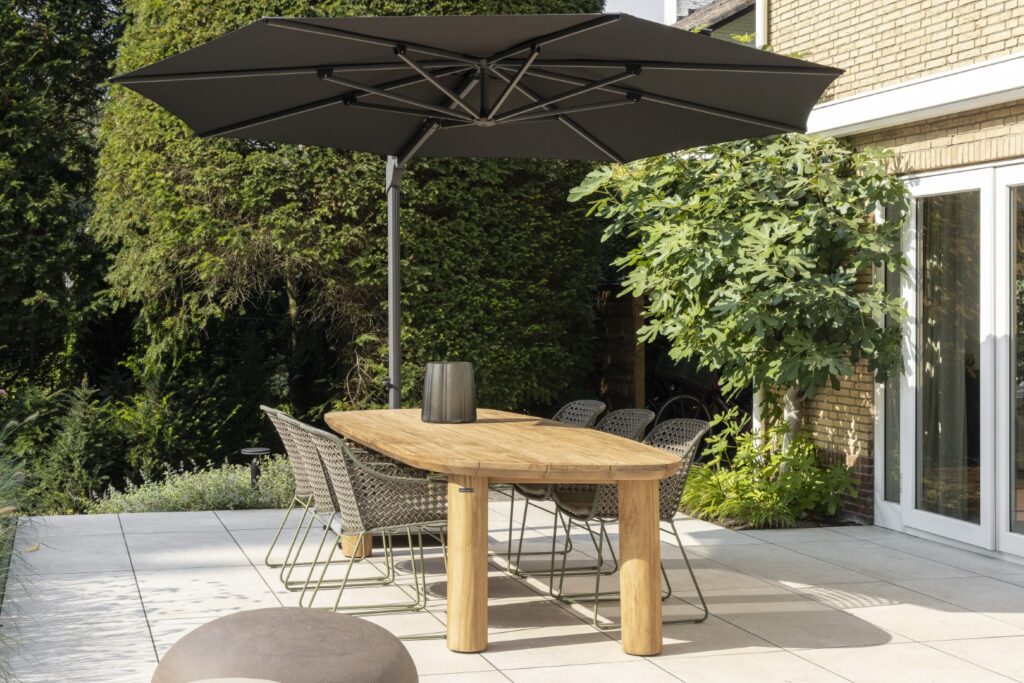De Tirenna tafel is een echte blikvanger dankzij haar solide, volumineuze poten en royale blad. De licht schuin aflopende randen voegen een subtiel detail toe, wat de tafel een verfijnde en elegante uitstraling geeft. Het unieke, dynamische ontwerp met lange asymmetrische zijdes brengt leven in elke buitenruimte, zonder te overheersen. Het gebruik van teakhout in een neutrale tint en rustige structuur zorgt ervoor dat de tafel naadloos in elke tuinsetting past. De sierlijke rondingen in zowel het blad als de poten creëren een harmonieus geheel, wat de Tirrena tafel niet alleen functioneel, maar ook stijlvol maakt.