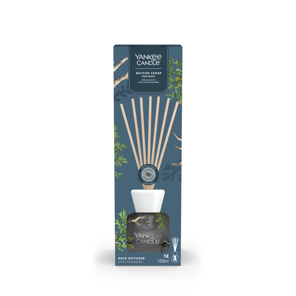 Yankee Candle Geurstokjes Bayside Cedar. Deze vernieuwde geurstokjes van Yankee Candle hebben een hele nieuwe look en bevatten 100 ml van de heerlijke Yankee Candle geuren.
